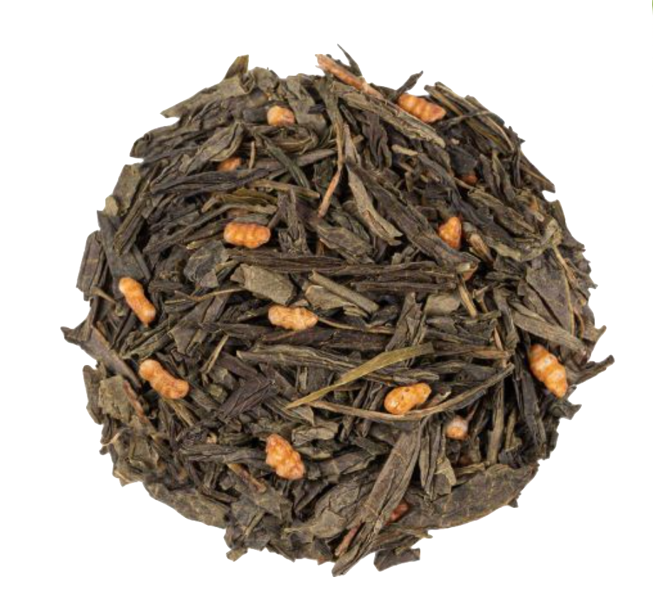 Bancha vert avec des grains de riz soufflés. Légère saveur de maïs. Feuilles longues et pressées.